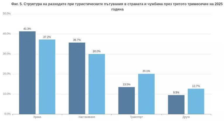 Българинът харчи средно около 500 лева, когато избере почивка в страната, показват последните данни на Националния статистически институт. При пътувания в чужбина сумата нараства до близо 900 лева. Най-голям дял от бюджета традиционно отива за храна – над 40% при вътрешните пътувания и 37% при международните. След тях се нареждат разходите за настаняване, а на трето място – транспортът.