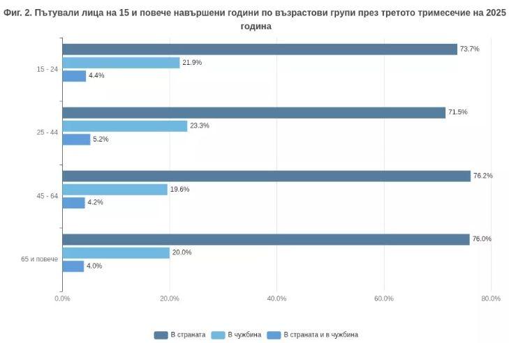 Въпреки разходите интересът към пътуванията остава висок. През юли, август и септември 2025 г. общо 1.9 милиона българи са пътували, което е ръст от 4.4% спрямо предходната година. Данните на НСИ ясно очертават предпочитанията: трима от четирима избират да почиват в България, докато един на всеки петима прекарва лятото само в чужбина. Едва 4.5% комбинират дестинации у нас и зад граница.