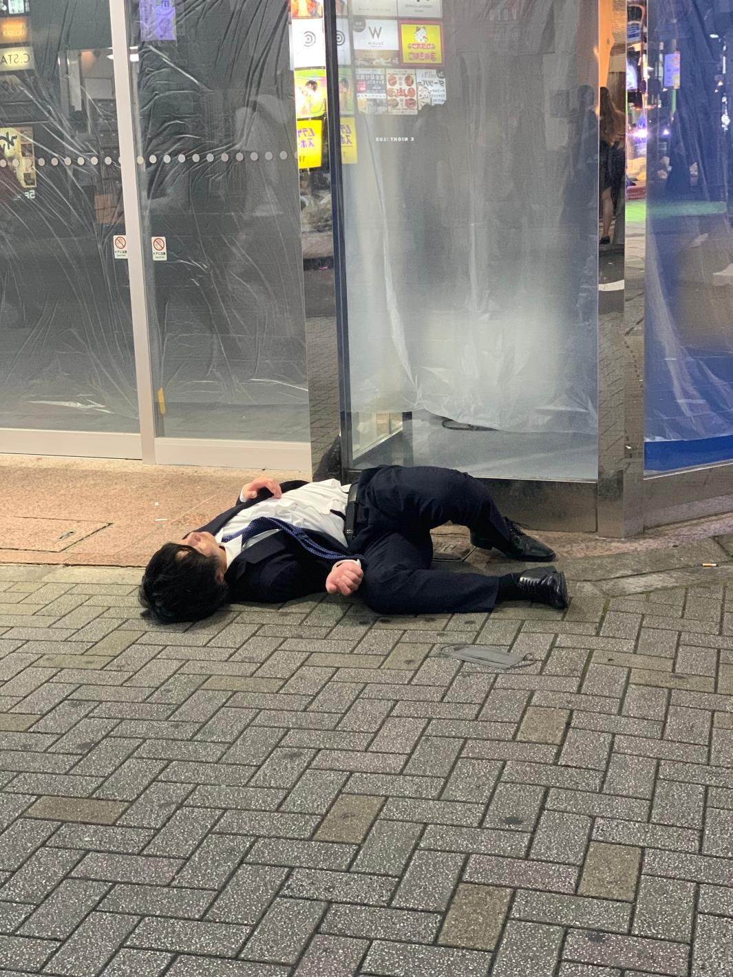 Изображения и видеоклипове, документиращи пияни хора, често в бизнес облекло, спящи по улиците на квартал Шибуя в Токио, привлякоха световно внимание.