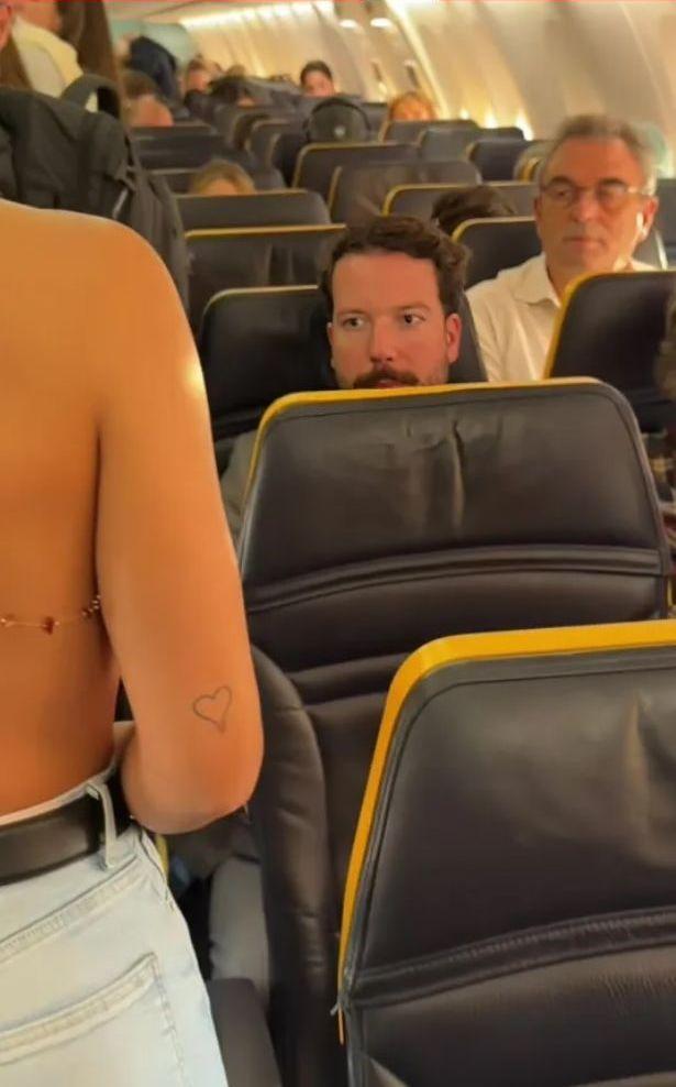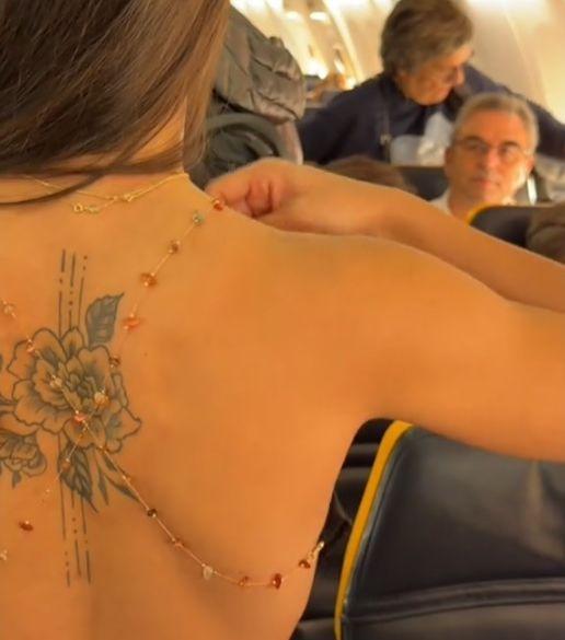 Жена на име Карла от Испания се появи сред останалите пътници с тесни дънки и топ с огромно деколте, като гърбът ѝ имаше само златни мънистени презрамки, които приличат повече на бижу, държащо парче плат, което едва покрива гърдите ѝ.