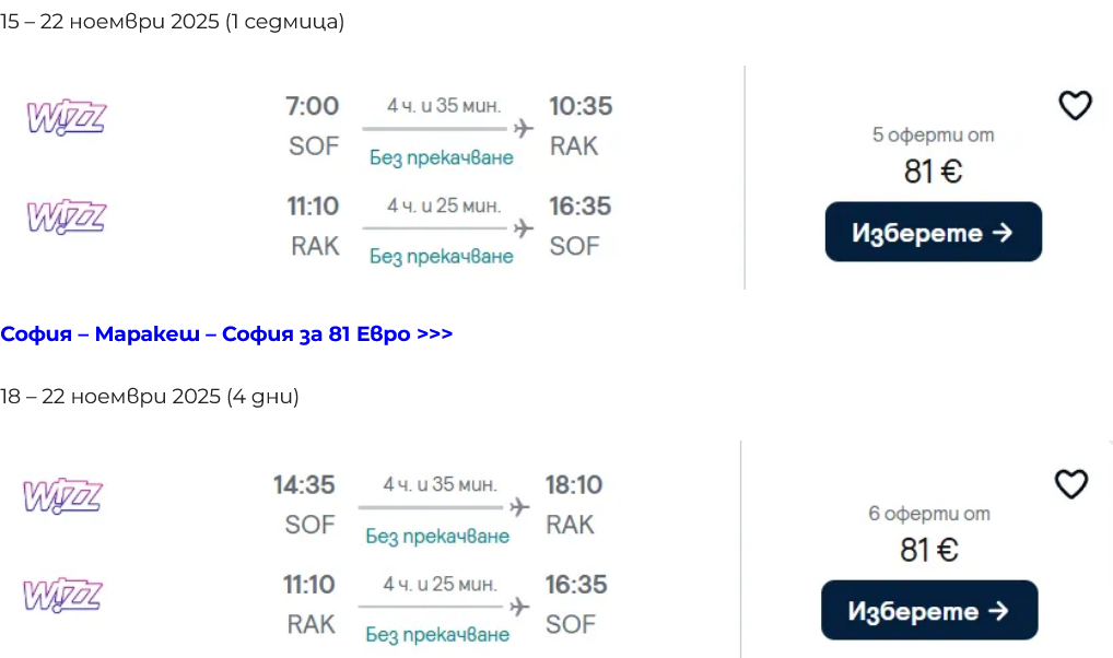Директните полети от София до Маракеш се изпълняват два пъти седмично, всеки вторник и събота. Цените на билетите започват от 40 EUR в посока. Това прави есента, зимата и пролетта идеални сезони за посещение, когато времето в Мароко е меко и слънчево.