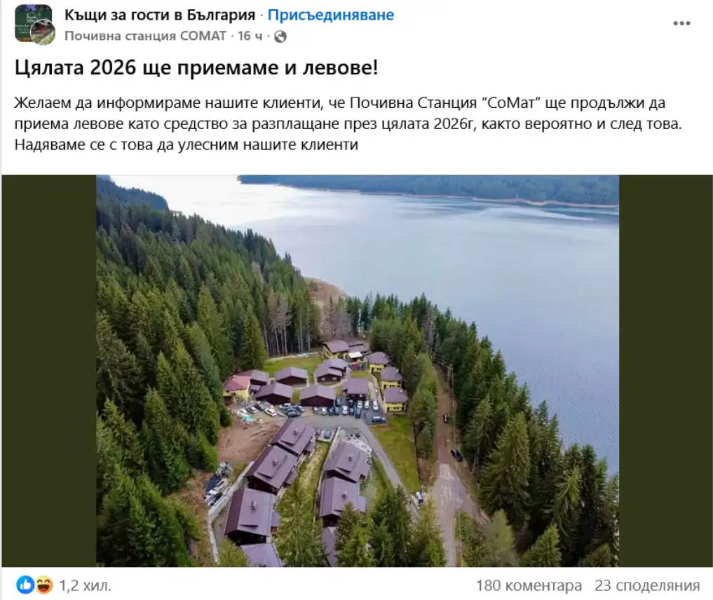 Почивна станция „СоМат“ зарадва своите клиенти, а и бъдещи такива. От райското кътче, което се намира край язовир „Доспат“, обявиха, че ще продължат да приема левове като средство за разплащане през цялата 2026 г.