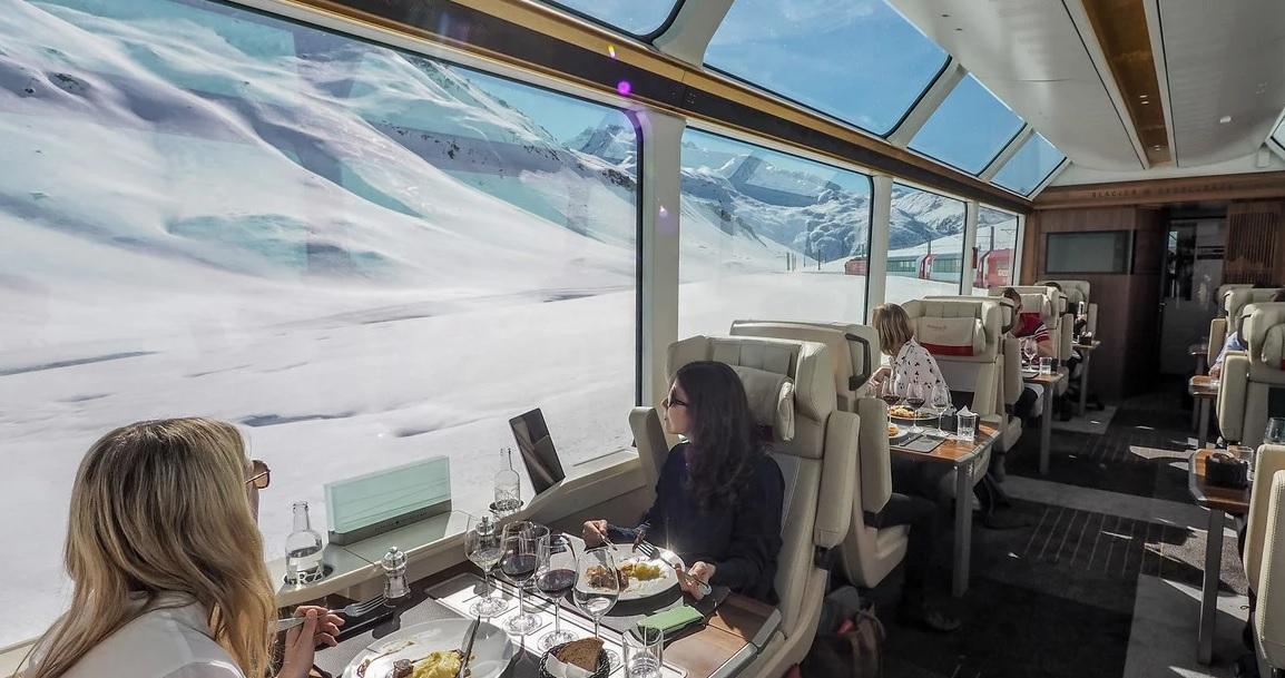 В Glacier Express можеш да се насладиш на топло гурме меню, приготвено на борда, с швейцарски вина и обслужване, достойно за бутиков хотел.