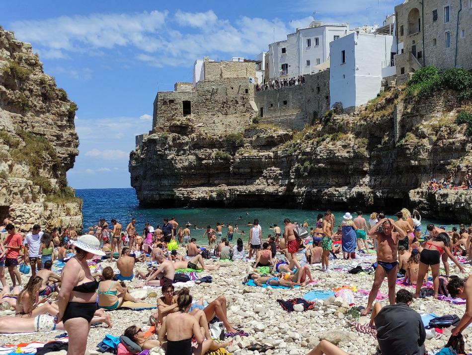 Сърцето на всяка снимка от Полиняно е емблематичният плаж “Lama Monachile” („Монашеско острие“). Това не е просто плаж, а перфектната природна сцена. Представете си малък каменист залив, притиснат от две гигантски скали, върху които са кацнали белите сгради на стария град. Тази гледка е визитната картичка не само на града, а на цяла Южна Италия.