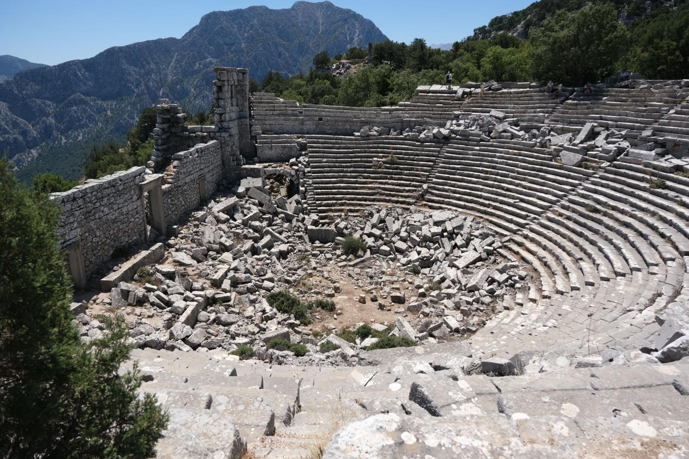 На върха на града се разкрива впечатляващ театър с капацитет около 4000 души. Построен вероятно преди римляните, той по-късно е обновен по римски модел. Гледката е зашеметяваща – планински клисури, свещената за местните планина и дори пристанището на Анталия в ясни дни.